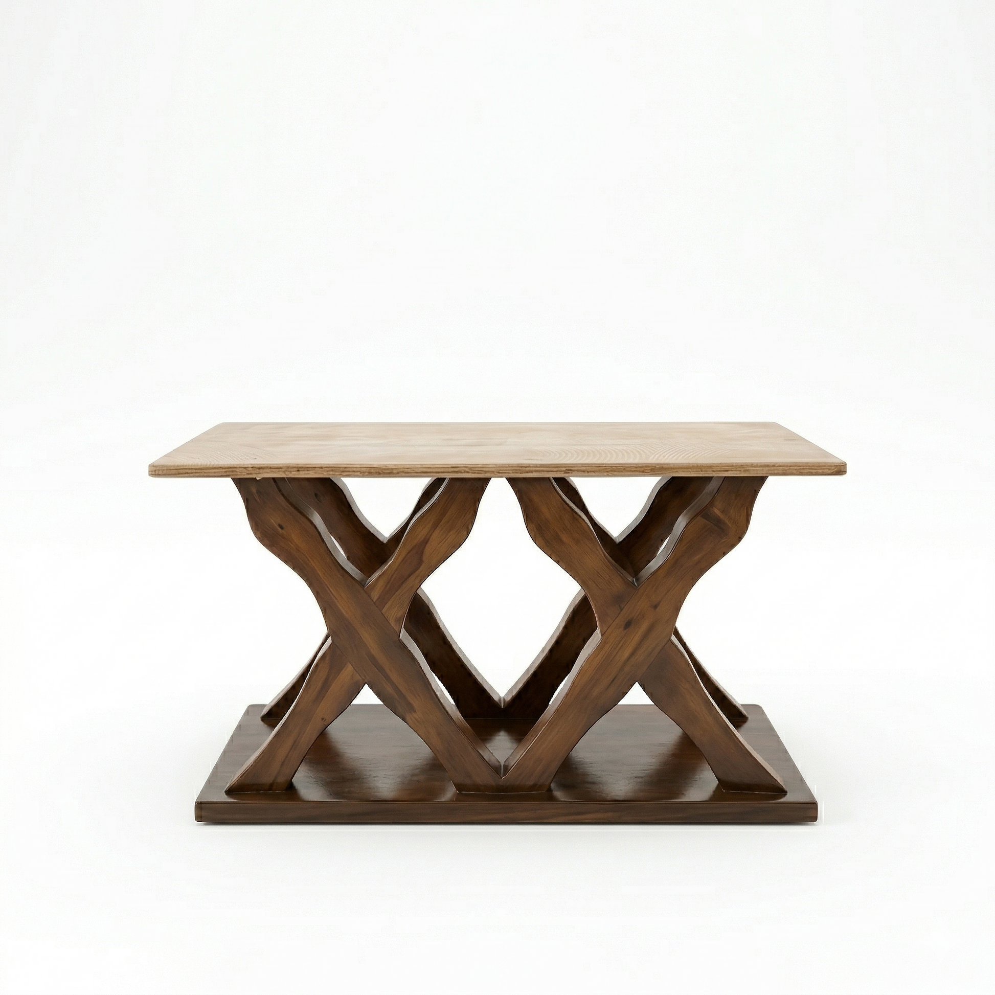 This modern designer coffee table stands out with its smooth glossy ply top and uniquely crafted geometric wooden base. The shining ply surface provides a sleek and contemporary look while being durable and easy to maintain. The artistic wooden base adds character and stability, making the table a perfect centerpiece for modern living rooms, lounges, or office spaces. Its bold design combines functionality with modern interior style.